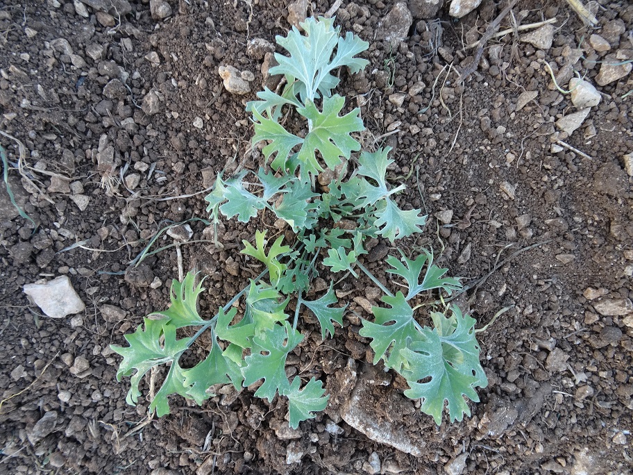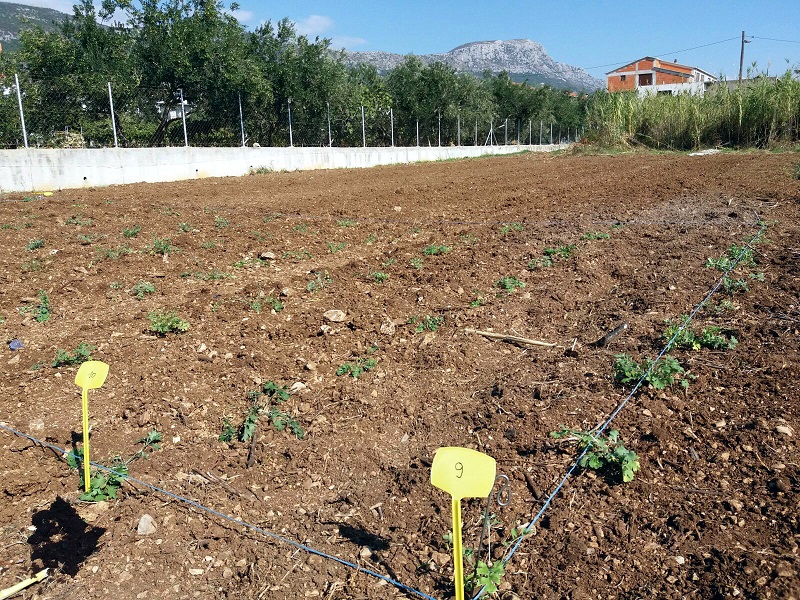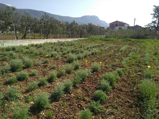 Postavljanje poljskog pokusa - mlada biljka dalmatinskog buhača; Kaštel Stari, 2017.